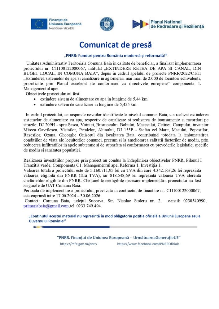 - Extinderea rețelei de alimentare cu apă și canalizare în comuna Baia. Valoarea proiectului este de 6.489.544,20 lei. Proiect în curs de execuție.